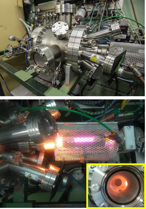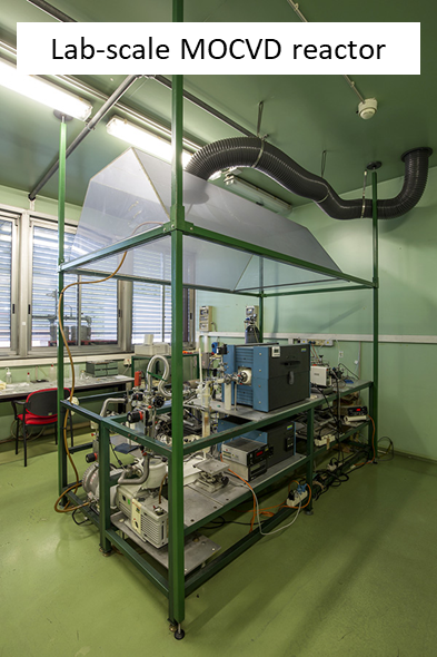 LP-CVD apparatus which operates as cold-wall MOCVD (upper) and PE-MOCVD equipped with an RF (13.56 MHz) capacity coupled device, which operates in-situ or in remote mode (lower).
