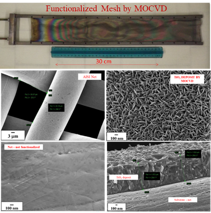 Example of large-scale stainless-steel mesh functionalized by TiO2 film via MOCVD with enhanced photocatalytic properties for water remediation.